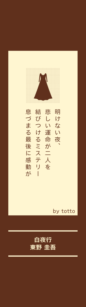 運命が若い2人を絶望 の中に導く。同じよう な不幸をおそう…。冷 徹に見つめる影は白い 光の中を行く。 東野圭吾の人気ミステ リーのいち押し。是非 読んで下さい。