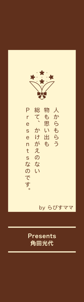 私達は一生の内に多く のPresentsを手にし ます。それにまつわる 思い出の数々を。 心にしみるものもあれ ば、苦い思いを伴うも のもあります。 そうして、私達はいつ の日にか最期の贈り物 に「ありがとう」の言 葉を残すでしょう。心 暖まる一冊です。