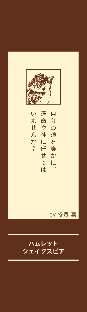 復讐はそれをする人間 の自己満足に過ぎない。 この言葉は本当だと思 う。復讐しても誰も幸 せになれない。だから 私はたとえ大切な人を 殺されても復讐はした くない。 でも、ハムレットのよ うに殺された本人から 復讐を頼まれたらどう するだろう。 「所詮あなたまかせさ。」 と運命に身を委ねられ るだろうか。