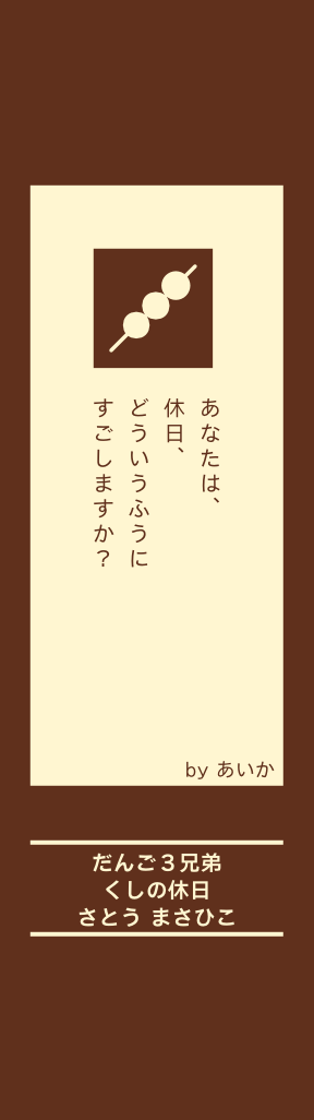 これは、だんご3兄弟 の3人がケンカして、 くしとはなれて、くし が1日休日をとり、い ろんなことをする話で す。 私もいろんなことをし てみたいと思います。