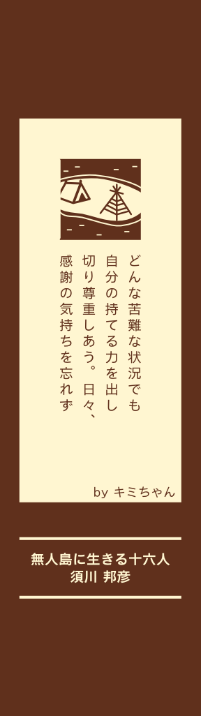 船が難破し、無人島で 暮らすことになった 16人の感動の実話。 明治31年、帆船、龍 睡丸が、太平洋上で座 礁した。ボートで脱出 する所からみんなの智 とたすけ合いの気持ち に引き込まれ、この先 どんな生活をしていく のだろうと、興味がわ く作品。“日本男児” のカッコ良さを示して くれた本でもある。