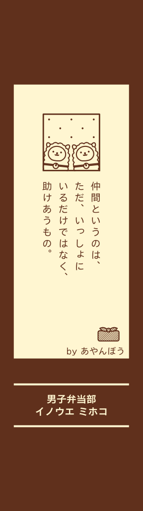 男子弁当部は、手良ソ ラ、滝口ユウタ、高野 タケルの3人がかって にけっせいして、毎週 水曜日に活動します。 そこで、その3人は、 手良ソラの家で弁当を 作ります。作るものは、 ライスバーガー、ビビ ンバどん、ドッキング 弁当などがあります。 わたしも食べてみたい です。