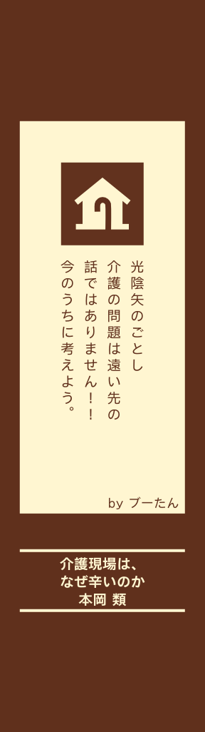 作家M氏のヘルパー体 験記。 2級の資格を取得したの でパートで勤めはじめた が…講習と実際は大違い。 あなただったら何ヶ月も ちますか? 救いは改善点がいくつも 見られることです。人手 不足の解消につなげてほ しい。 著者は成高の卒業生です。