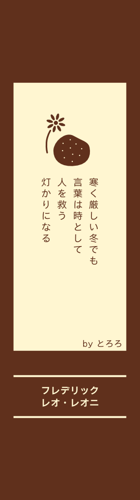 みんなが夏の間いっしょ うけんめいはたらいて いるとき、フレデリッ クは何もしません。 ところが、灰色の冬に なると、彼の語る色や 言葉で、仲間ののねず みたちは元気をとり戻 します。 生きるために必要なの はパンだけではない、 と語りかけてくれる絵 本です。