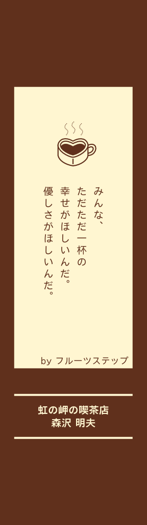 苦しい事があったり、 悲しい事があったり、 傷ついている心をそっ と癒してくれます。優 しさって、こんなに温 かいものだったんだ… 壊れてしまった心に、 一杯のコーヒーと音楽 そして、喫茶店の女主 人の投げかける言葉が 染み入り、ぽかぽかと 胸があったかあくなる。 あなたも来て下さい。 「岬カフェ」でお待ち しております。