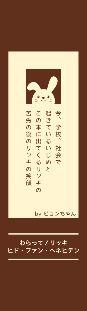 少しだけ他のウサギと 違ったリッキの耳。 初め悩み色々な方法を トライし、人参を耳に 入れて他のウサギと一 回だけいっしょになっ た時のリッキの喜びは、 測りきれないと思った。 何か、子供達のかかえ ている問題の一つに感 じられた。
